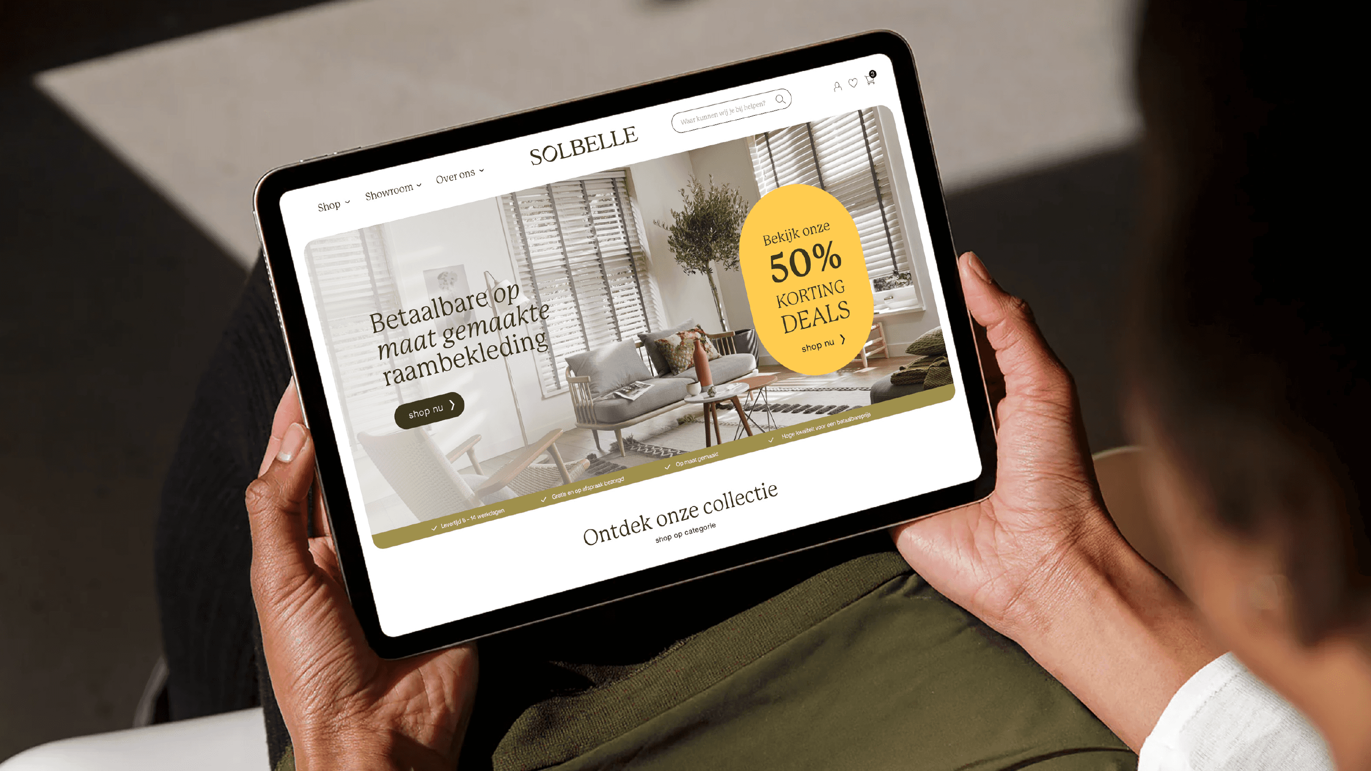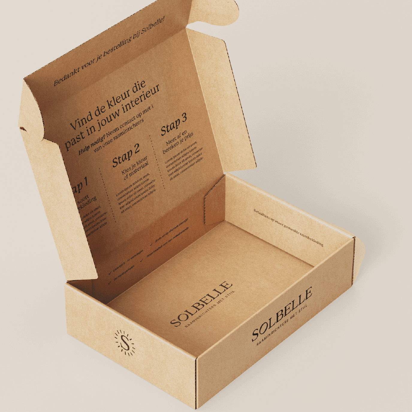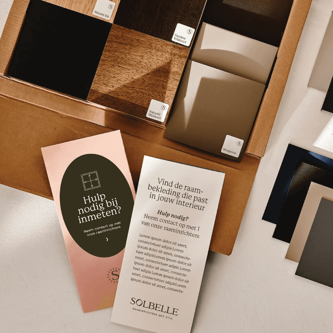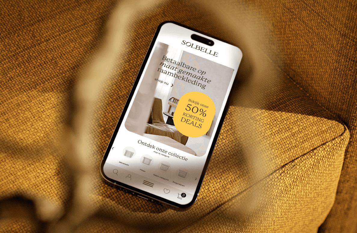 We haalden naar boven waar het echt om draait: toegankelijke luxe, geworteld in vakmanschap. Dat werd het fundament voor een nieuwe naam, heldere positionering en een merkidentiteit die recht doet aan de zorg, kwaliteit en het karakter achter het product. De naam Solbelle vangt precies die sfeer. Zacht, elegant en geïnspireerd op de zon, de natuurlijke partner van elke raamdecoratie. Een naam die warmte, licht en stijl oproept. Net als de ruimtes die hun producten helpen creëren. Ook de nieuwe stijl is geïnspireerd op licht. Letterlijk. Met zachte, zon- overgoten kleuren, afgeronde vormen die doen denken aan raamopeningen, en een tone of voice die tegelijk warm en zelfverzekerd is.